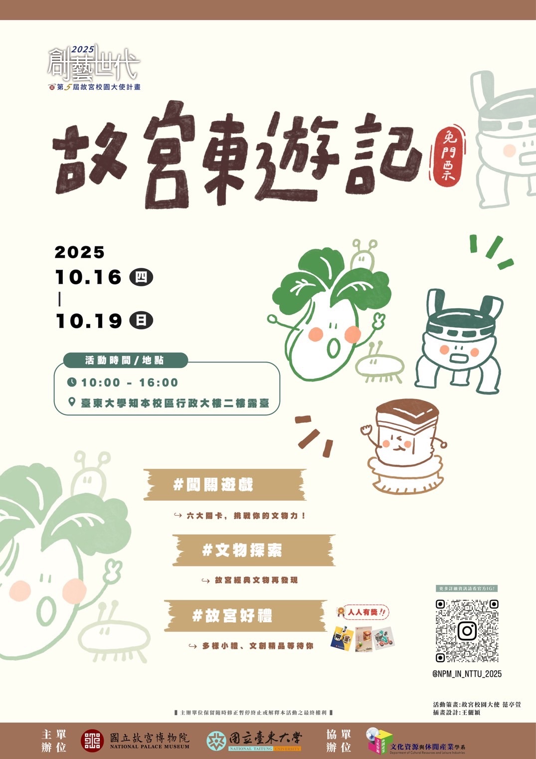 本活動為國立故宮博物院與本校共同舉辦之校園推廣計畫,由故宮校園大使策劃執行,旨在透過創意文化體驗拉近年輕世代與故宮的距離,將故宮典藏之美推廣至臺東地區校園與社區,期盼促進師生及市民對故宮的認識與活動參與。